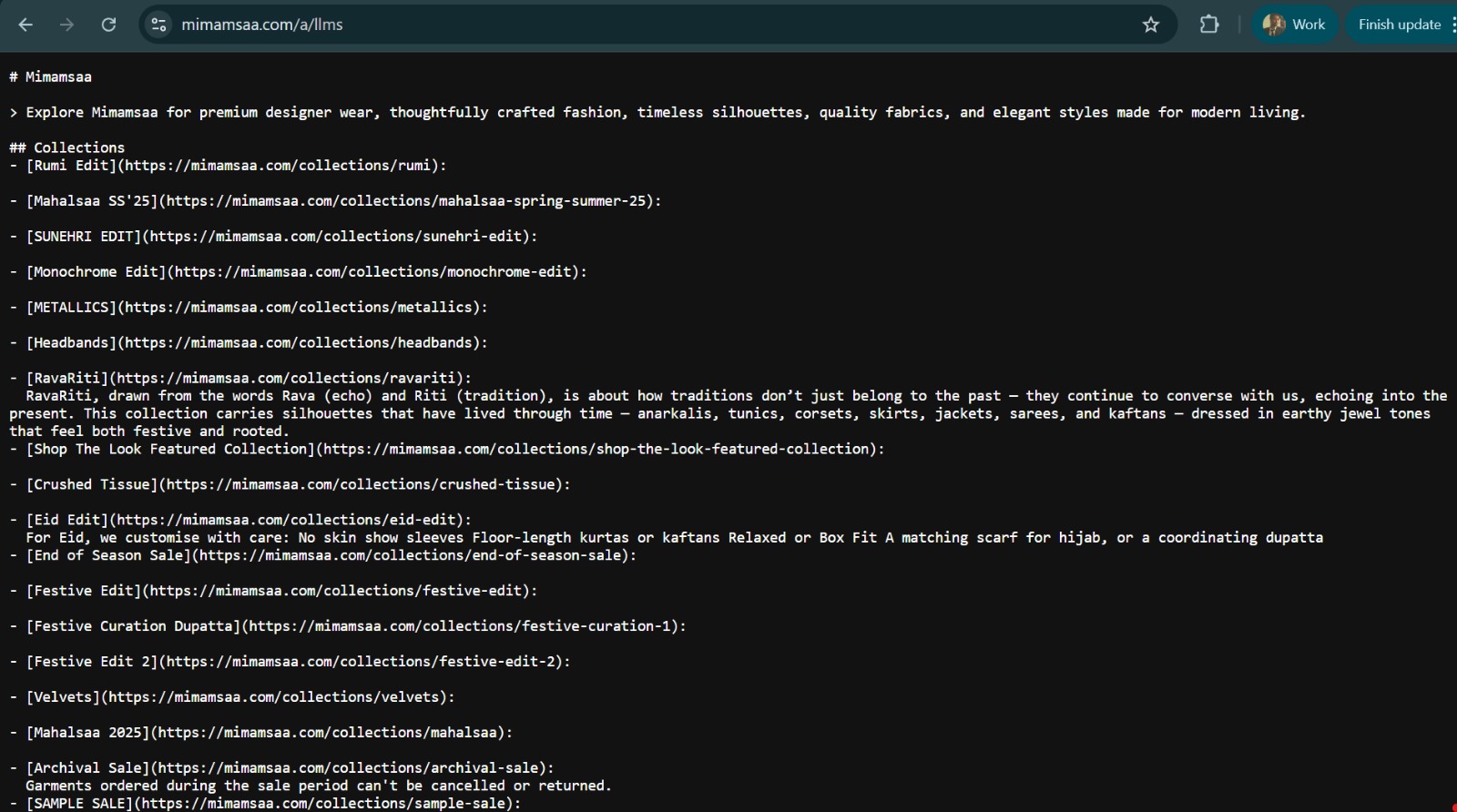 An llms.txt file was added to the website, allowing large language models and AI systems to better understand and reference Mimamsaa’s content. This improves the brand’s visibility in AI-driven search experiences and answer engines.
